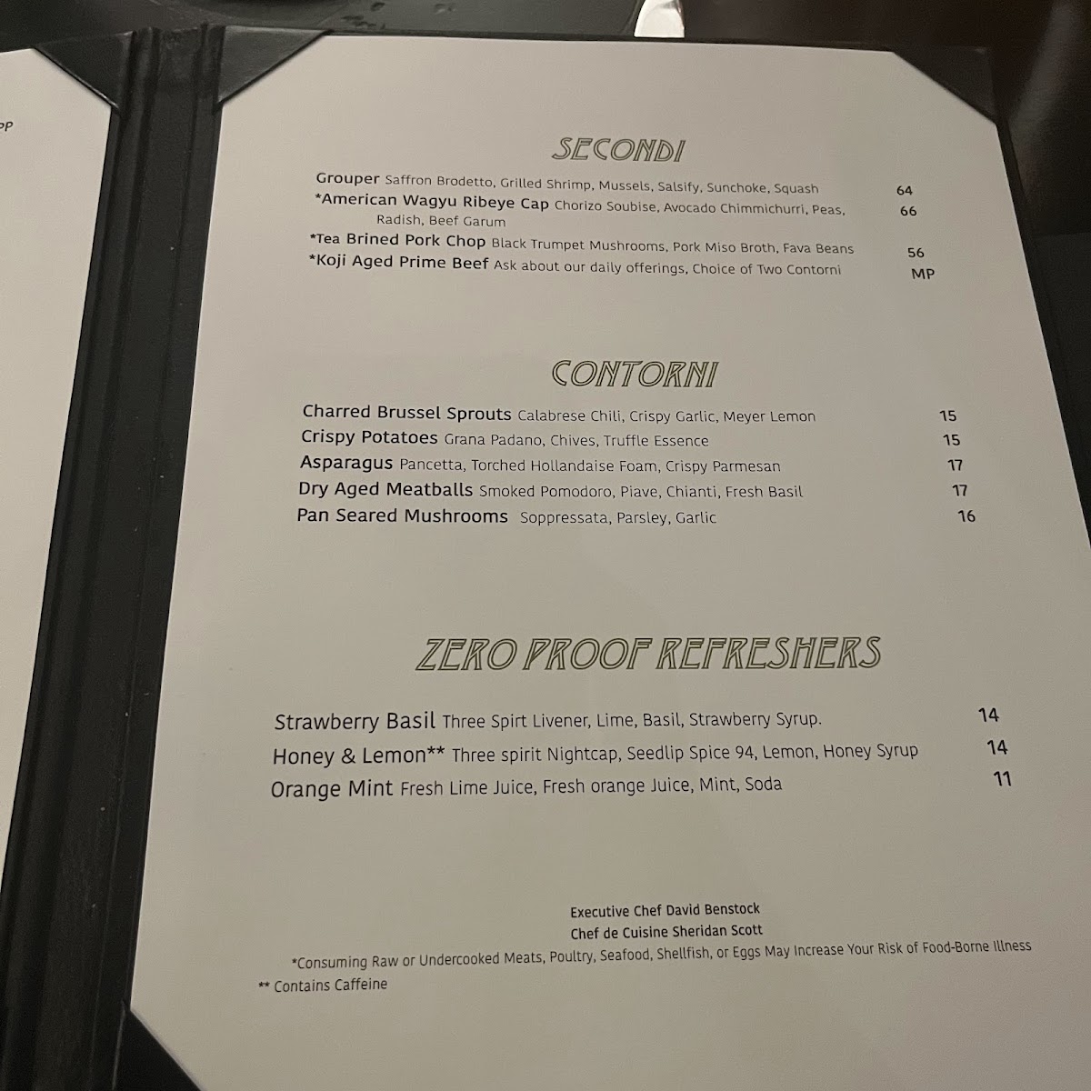 The Contorni section is equally enticing, showcasing dishes such as Crispy Potatoes infused with truffle essence and Caramelized Brussels Sprouts that tantalize the palate.